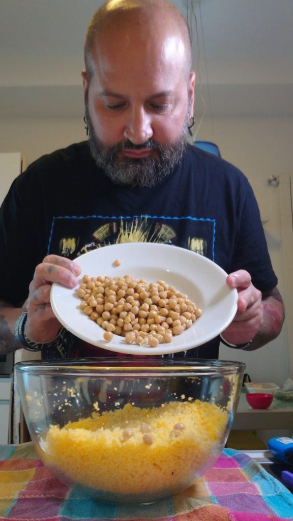 Quand le couscous est complètement refroidi, égrène-le soigneusement avec une fourchette pour le rendre léger et aéré.