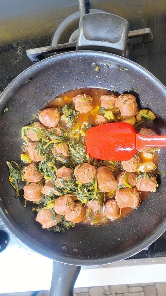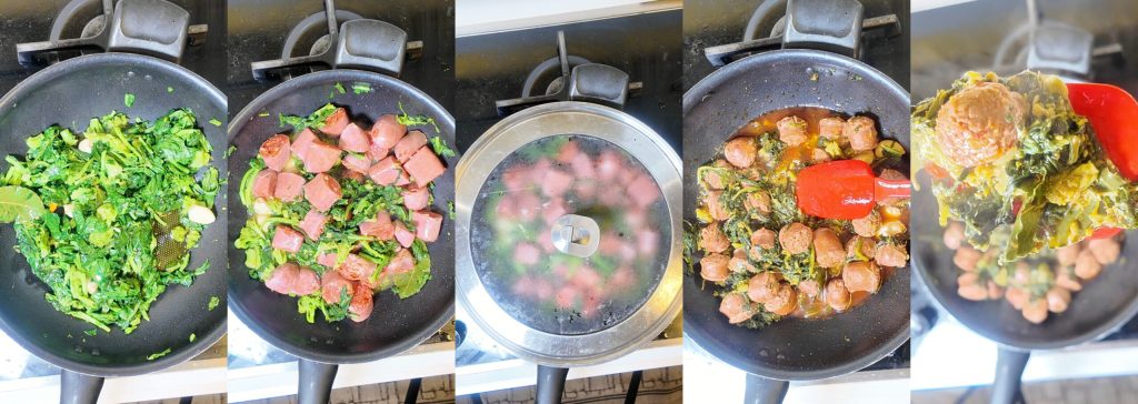 De cette façon, la graisse qui fond de la saucisse parfume les cimes de rapa pendant qu’elles finissent de cuire, créant une combinaison de saveurs unique.