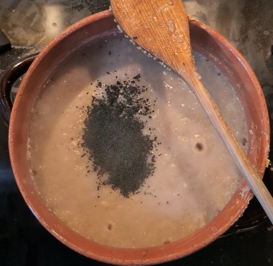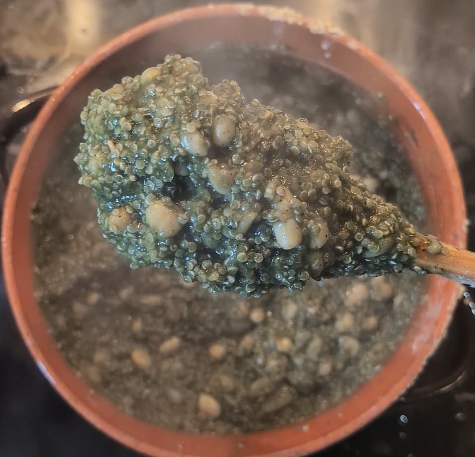 • Enfin, quand le quinoa est prêt, éteignez le gaz et ajoutez 2 cuillères à soupe de spiruline. Mélangez bien pour amalgamer la spiruline à la soupe, puis couvrez la marmite et laissez reposer quelques minutes. De cette manière, les saveurs auront le temps de se mélanger et la soupe sera encore plus savoureuse.