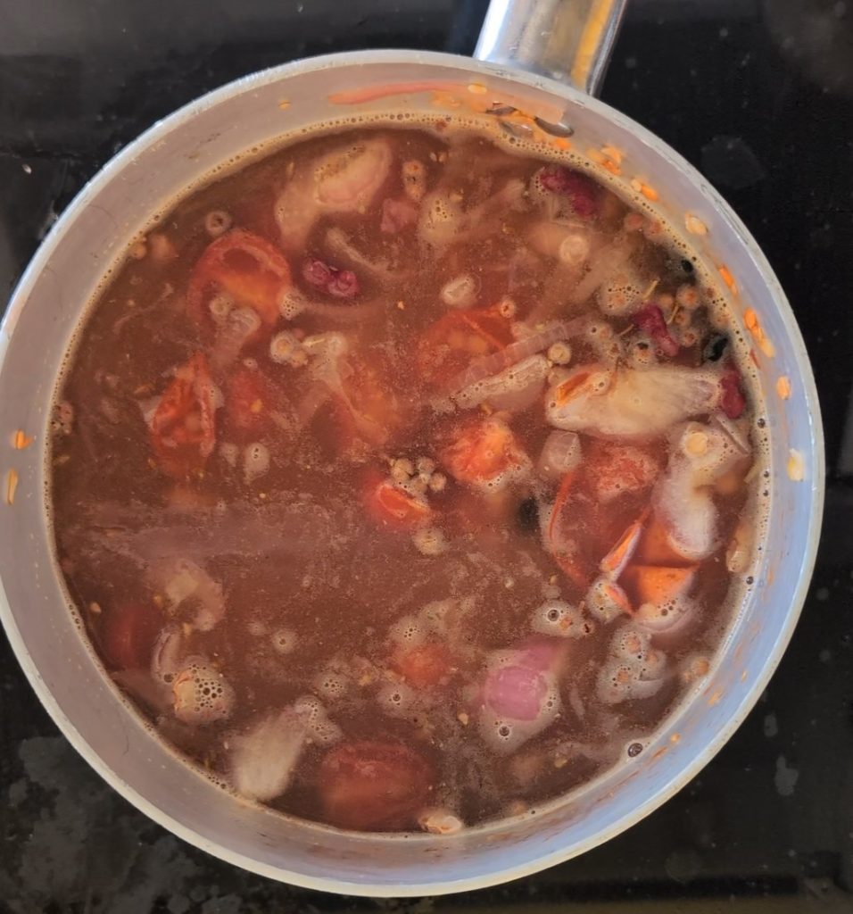 • Pour préparer la soupe de légumineuses mélangées, je fais revenir dans une casserole à bords hauts l’ail, l’oignon et le poivre avec un demi-verre d’eau et une cuillère à café de vinaigre. De cette façon, les arômes des légumes sont préservés sans besoin de frire, réduisant l’apport calorique. Pour une touche personnelle, j’ai ajouté une pincée de poivre de Sichuan, mais vous pouvez utiliser le poivre de votre choix