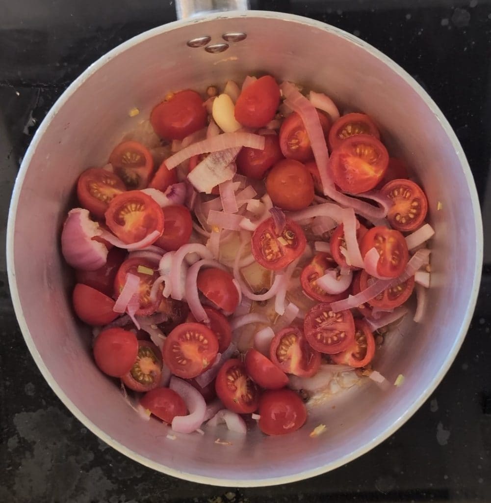 • Après avoir fait revenir l’ail, l’oignon et le poivre, j’ai ajouté les tomates cerises coupées en deux et les ai fait revenir ensemble pendant une minute. J’ai aussi ajouté le gros sel.
