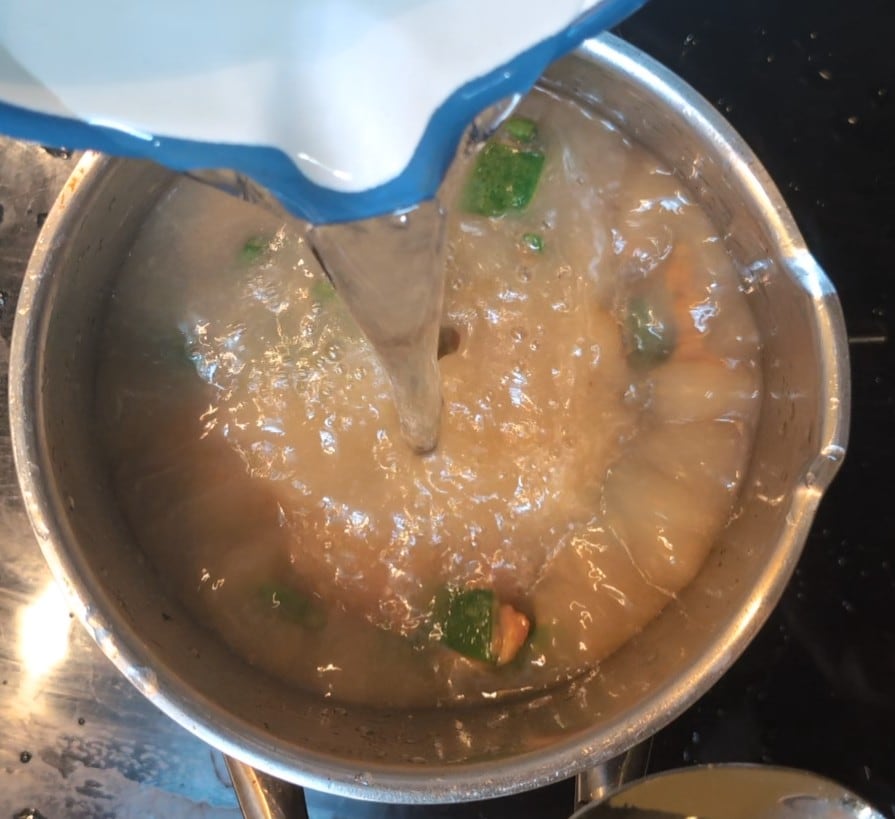 Ensuite, j’ai ajouté le miso en pâte et j’ai mélangé à feu doux jusqu’à ce qu’il soit complètement dissous, l’incorporant parfaitement aux légumes du sauté.