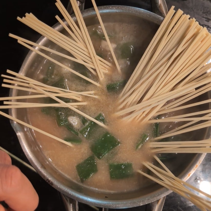 Dès que le miso était dissous et incorporé aux légumes, j’ai ajouté de l’eau jusqu’à couvrir complètement tous les ingrédients. J’ai ensuite porté à ébullition et cuit pendant 5 minutes à feu vif, préservant le croquant des pois mangetout.