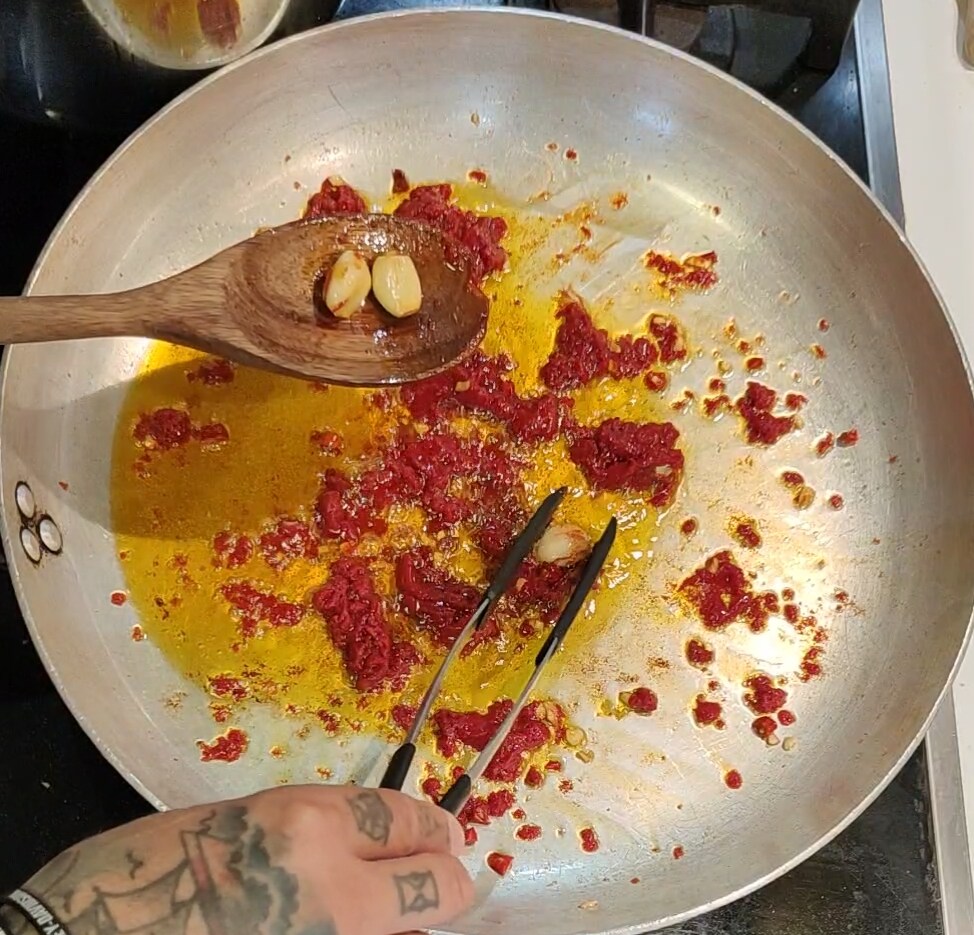 Dès que l’ail finement haché commence à prendre couleur, ajoutez le concentré de tomates et retirez les deux gousses d’ail entières.