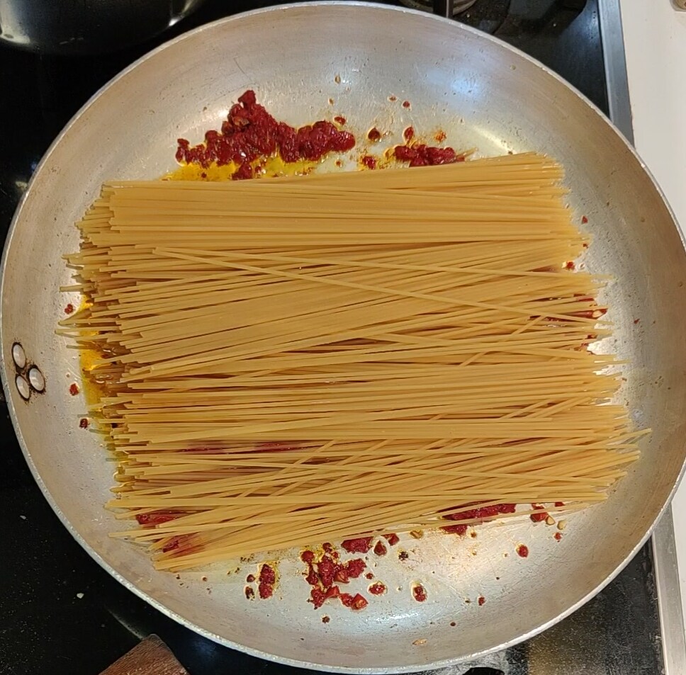 Puis, mettez les spaghetti crus dans une poêle assez grande pour contenir les spaghetti sans les casser ou les plier, en essayant de couvrir toute la surface de la poêle avec une ou deux couches de spaghetti et laissez griller.