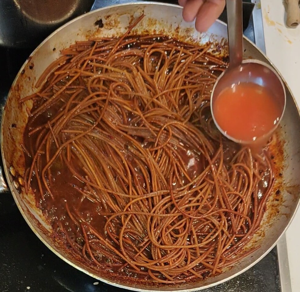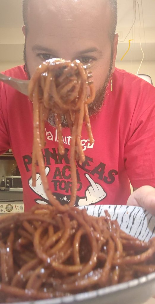Oui, il peut arriver de manger des spaghetti plus doux et des spaghetti plus croquants parce qu’en plus d’être plus grillés, ils sont restés collés. Mais c’est la partie la plus savoureuse.