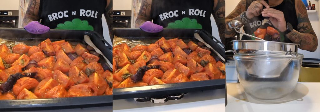 Une fois cuites, sortons les tomates du four et laissons-les refroidir pendant une dizaine de minutes. Après ce temps, à l’aide d’un passe-vite, passons soigneusement tout le mélange, y compris les épices, l’ail et l’oignon.