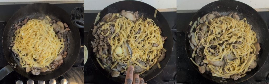 • Lorsque les tagliatelles sont cuites al dente, égouttez-les directement dans la poêle avec les cèpes et la saucisse. N’oubliez pas de conserver une demi-louche d’eau de cuisson, un ingrédient secret qui contribuera à créer une sauce crémeuse et enveloppante. Mélangez soigneusement, en faisant sauter délicatement les pâtes pour amalgamer tous les ingrédients et permettre aux saveurs de se fondre harmonieusement. L’eau de cuisson, riche en amidon, se mêlera aux jus libérés par les champignons et la saucisse, créant une délicieuse émulsion naturelle.Enfin, la touche magique : ajoutez le beurre aromatisé que nous avons préparé au début. Le beurre froid, au contact des pâtes chaudes, fondra lentement, libérant ses parfums et enveloppant les tagliatelles dans une étreinte crémeuse et irrésistible. Mélangez encore une fois pour répartir uniformément le beurre et laissez reposer quelques minutes pour faire émerger toutes les saveurs.