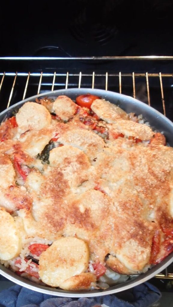 La tiella sera prête lorsque le riz sera cuit, les pommes de terre tendres (faites le test en piquant une tranche avec les dents d’une fourchette) et la surface bien dorée et gratinée.
