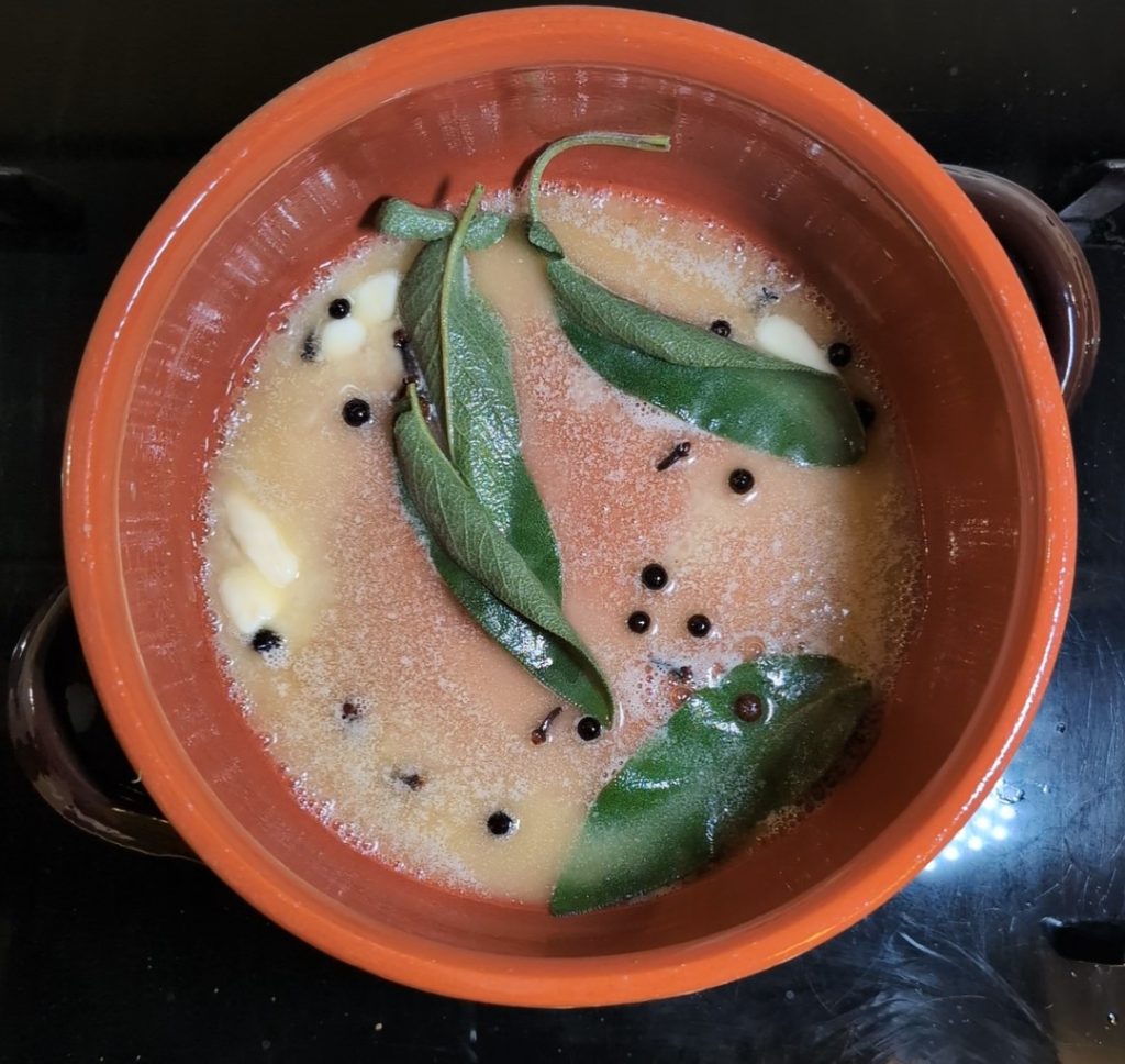 Ensuite, pour la recette, j’ai utilisé une casserole en terre cuite et j’ai fait fondre le beurre avec les feuilles de sauge et le reste des épices, c’est-à-dire les clous de girofle et les baies de genièvre écrasées, afin de libérer plus d’arôme. En alternative, vous pouvez utiliser la casserole de votre choix, mais je vous recommande d’utiliser une casserole en terre cuite, qui retient mieux la chaleur et permet à la tripe de cuire uniformément.