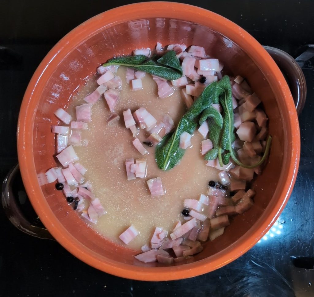Après avoir fait fondre le beurre dans la casserole en terre cuite et l’avoir parfumé avec les épices, ajoutez le lard et faites-le dorer doucement jusqu’à ce qu’il commence à changer de couleur.