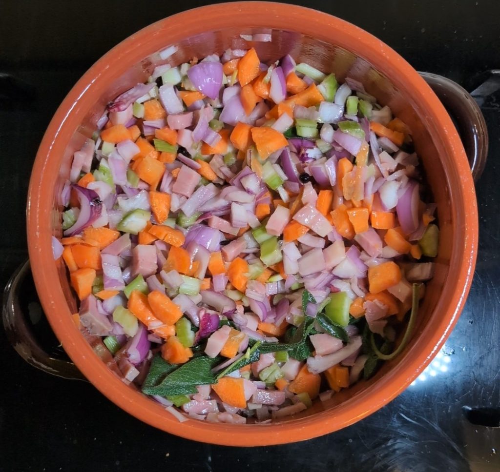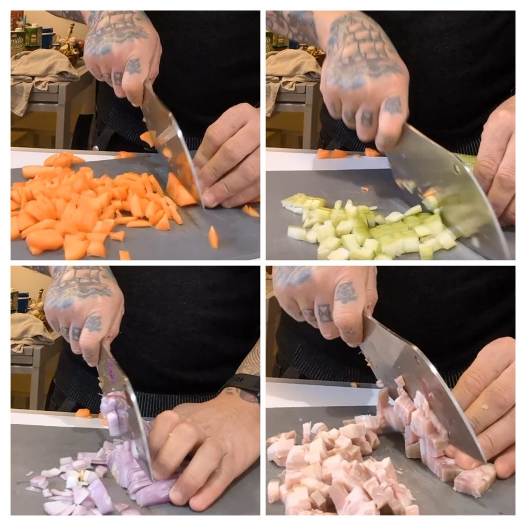J’ai commencé à préparer la trippa à la milanaise, la recette traditionnelle lombarde. Tout d’abord, j’ai coupé un oignon, deux carottes et une branche de céleri en morceaux d’environ un centimètre. J’ai ajouté aussi une tranche de lard fumé.