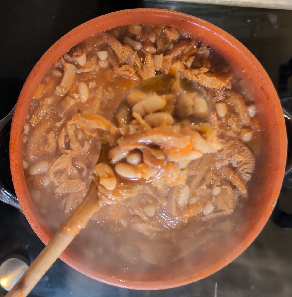 Après avoir ajouté le concentré de tomate, mélangeons-le bien à la tripe et laissons cuire à feu doux pendant 2 heures et 30, avec le couvercle entrouvert pour laisser évaporer l’excès de vapeur et réduire le bouillon.