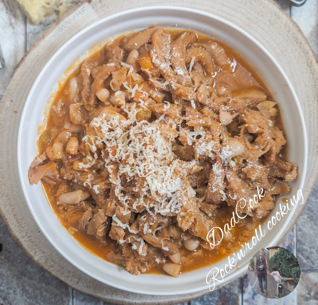 Pour cette recette, j’ai utilisé de la tripe précuite, lavée et déjà coupée.