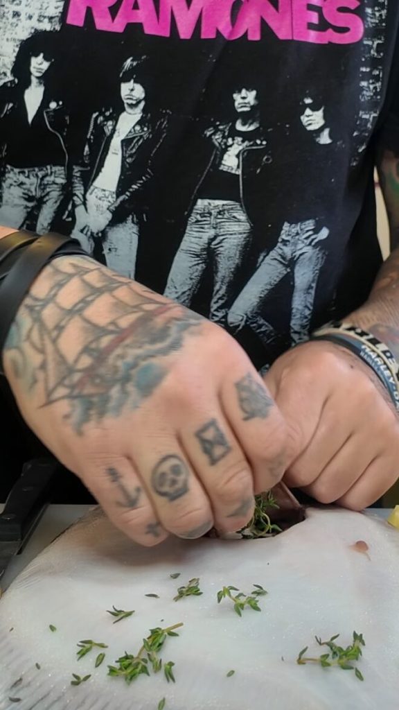 Prenons les deux gousses d’ail, les écrasons délicatement (sans les éplucher) et les insérons dans le ventre du turbot avec quelques brins de thym frais.