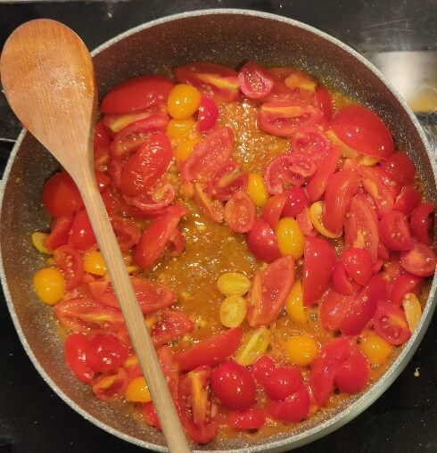Si vous préférez, vous pouvez également mettre de l’ail en poudre et dès que ça commence à grésiller, ajoutez toutes les tomates cerises et faites-les cuire à feu vif pendant environ dix minutes.