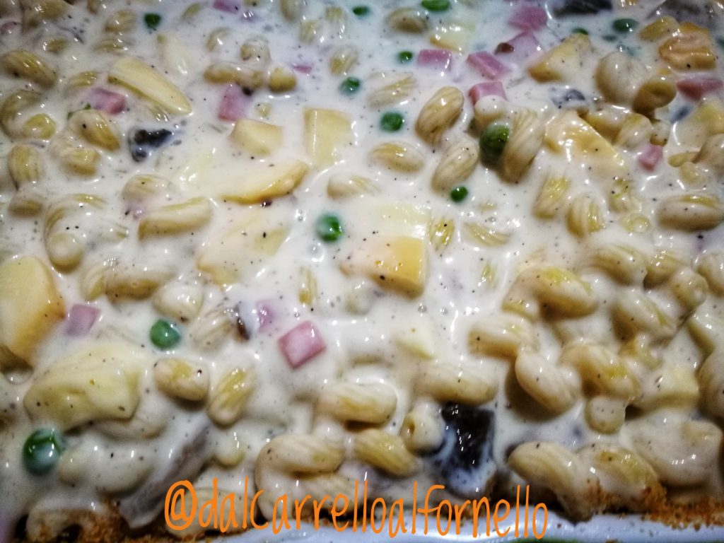 Ajoutez aux pâtes les champignons, les petits pois, le jambon en dés et la scamorza à peine sortis du frigo, et la béchamel.
