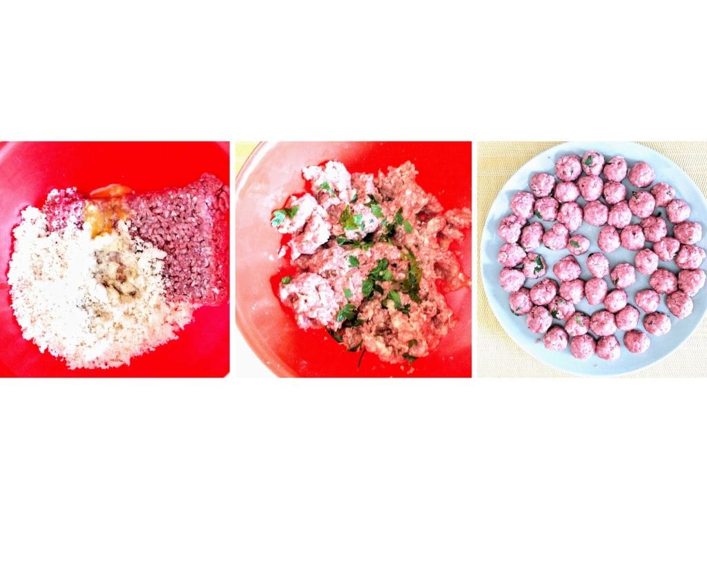 Dans un bol, travaillez la viande hachée avec la mie mixée, les œufs, le persil, la noix de muscade, le parmesan et le sel. Mélangez bien les ingrédients avec les mains, jusqu’à obtenir une pâte homogène.