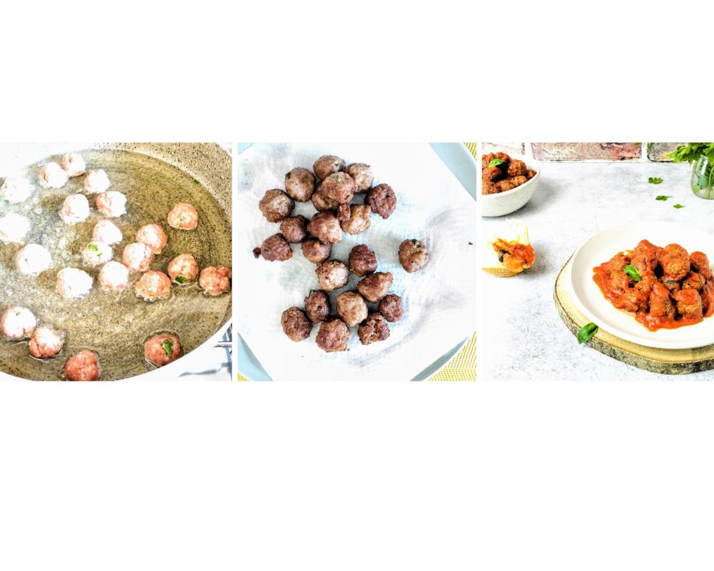 Plongez les boulettes frites dans la sauce tomate et laissez-les s’imprégner à feu doux pendant cinq minutes, en remuant délicatement.