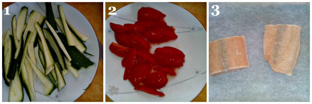 Lavez et équeutez les courgettes. Puis coupez-les en bâtonnets (1). Lavez les tomates cerises, séchez-les bien et coupez-les en quartiers (2). Salez-les légèrement. Tapissez un plat d’un papier cuisson ; disposez-y les filets de saumon sans la peau et les arêtes (3)