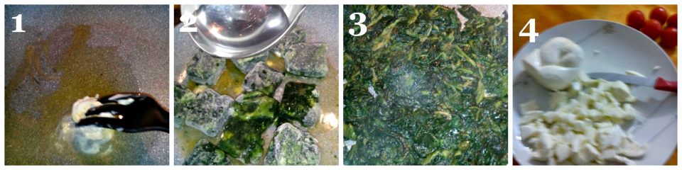 Dans une casserole, faites fondre une noix de beurre avec une cuillère d’huile d’olive extra vierge (1). Ajoutez les épinards et une louche d’eau. Salez les épinards et couvrez la casserole (2). Faites cuire les épinards pendant dix minutes ou jusqu’à ce qu’ils soient secs (3). Retirez-les du feu et laissez-les refroidir. Coupez la mozzarella fiordilatte en dés (4).