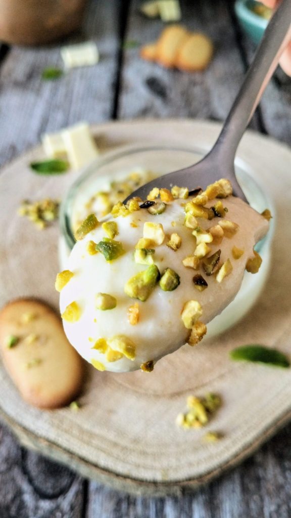 Elle est parfaite à servir dans des petites coupes avec des fruits frais, des biscuits émiettés, des copeaux de chocolat ou des éclats de pistache ou de noisette. Vous pouvez aussi la préparer à l’avance et la conserver au réfrigérateur jusqu’au moment de la servir, pour un effet ‘wow’ garanti.