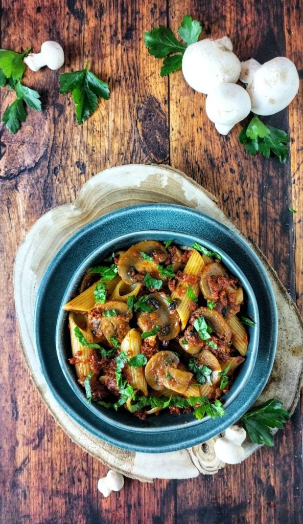 Les pâtes aux champignons et pesto de tomates séchées sont le plat parfait pour ceux qui aiment les saveurs authentiques.