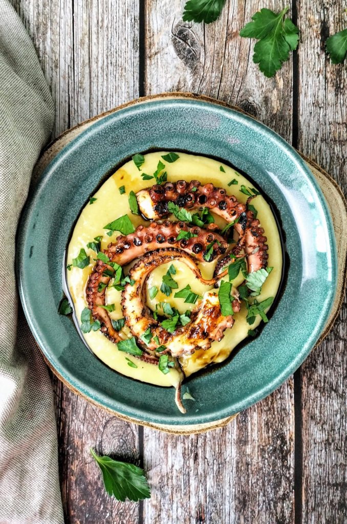 Dans cette recette, le poulpe avec sa chair tendre et savoureuse est associé à une délicate crème de pommes de terre et garni de vinaigre balsamique. Une combinaison parfaite et enveloppante. C’est aussi un plat joli à voir, avec sa présentation spectaculaire, ce qui le rend parfait à servir lors d’occasions spéciales.