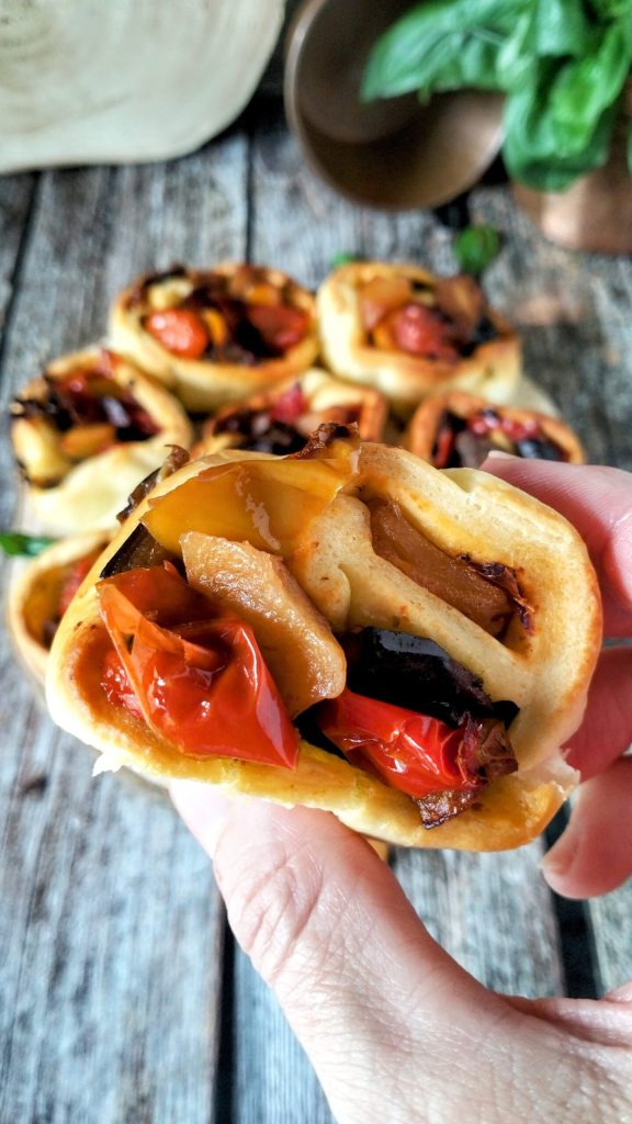 Une fois la base garnie, il suffit de la rouler et de la couper en tranches : en quelques minutes, vous obtiendrez des roulés moelleux et fondants, parfaits à servir chauds à peine sortis du four. Les roulés de pizza aux légumes sont aussi une excellente solution pour vider le frigo, personnalisables avec les légumes de saison ou avec ce que vous avez à disposition.