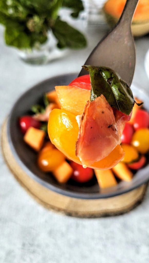 La salade de melon et speck est meilleure si consommée immédiatement après la préparation, mais peut être conservée au réfrigérateur pendant 1 jour, dans un récipient hermétique.