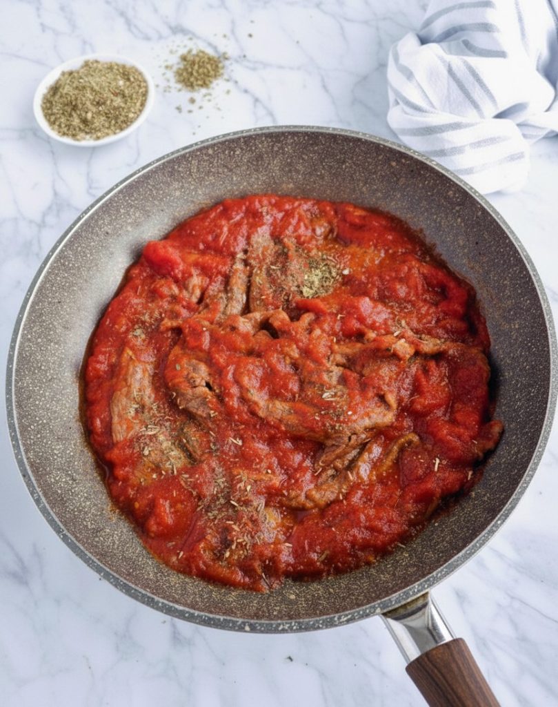 Mettez dans le fond de cuisson la gousse d’ail écrasée, faites-la blondir et ajoutez-y la pulpe de tomate. Assaisonnez avec du sel et une cuillère à soupe d’origan. Après une dizaine de minutes, ajoutez aux tomates les straccetti de viande et laissez-les s’imprégner pendant quelques secondes.
