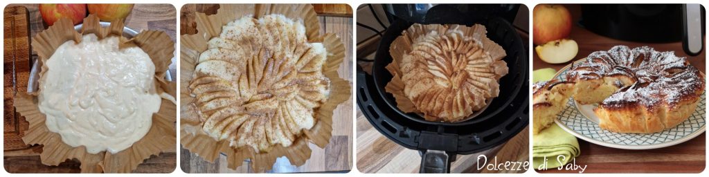 • Après ce temps, votre gâteau aux pommes ne sera pas encore cuit, donc baissez la température à 165° et laissez cuire encore 10 minutes. Après ce temps, munissez-vous d’un cure-dent et faites le test classique du cure-dent qui se fait aussi avec la cuisson au four. Le gâteau aux pommes sera légèrement humide, c’est normal. Donc laissez-le reposer au moins 10-12 minutes avant de le retirer du moule. Si par contre il est très humide, il faudra encore quelques minutes de cuisson. À ce stade, saupoudrez de sucre glace si vous le souhaitez et dégustez votre gâteau aux pommes cuit dans une friteuse à air, il est vraiment délicieux.