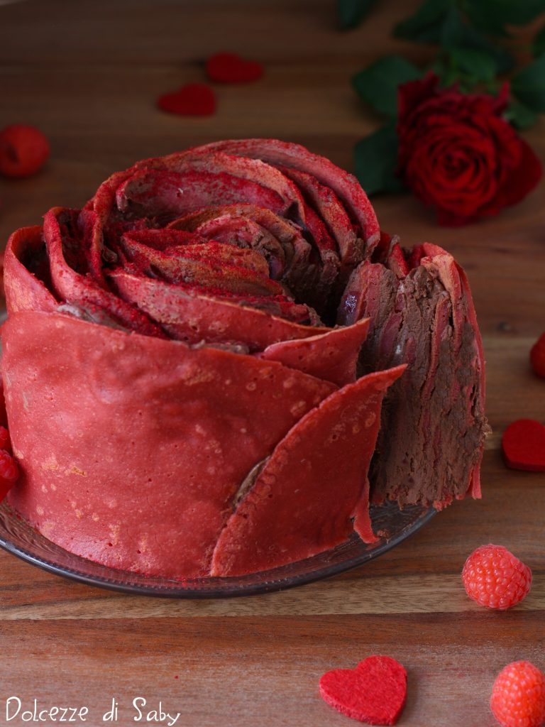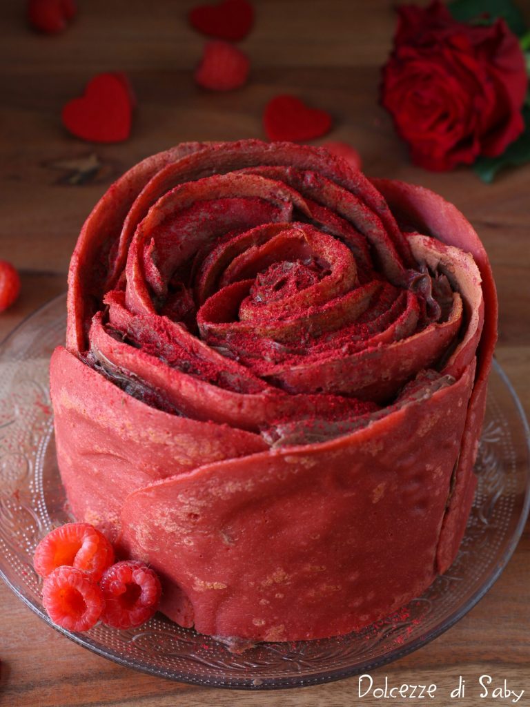Aujourd’hui, je veux vous proposer une vraie perle, le gâteau rose de crêpes. Un dessert très simple à réaliser et l’effet final vous surprendra, car la forme sera celle d’une grande rose rouge, parfaite à préparer non seulement pour la Saint-Valentin, mais aussi pour la fête des mères ou simplement pour quelqu’un que vous aimez. Pour cette recette, j’ai préparé des crêpes aux framboises avec de la poudre de fruits, mais si vous le souhaitez, vous pouvez préparer des crêpes classiques ou au cacao et les garnir comme vous le souhaitez. Mais maintenant, voyons ensemble la recette qui suit.