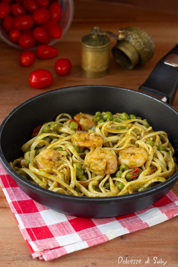 À ce stade, faites cuire les pâtes dans l’eau salée jusqu’à 3-4 minutes avant le temps de cuisson indiqué sur l’emballage. Pendant ce temps, les légumes dans la poêle seront bien cuits, je vous conseille donc d’ajouter les crevettes et un autre 1-2 louches d’eau de cuisson des pâtes. Les pâtes seront également bien al dente, alors ajoutez-les dans la poêle et laissez-les sauter avec les légumes et les crevettes. Enfin, ajoutez le pesto et mélangez bien. Vos linguine aux crevettes et légumes sont prêtes à être servies, bon appétit.