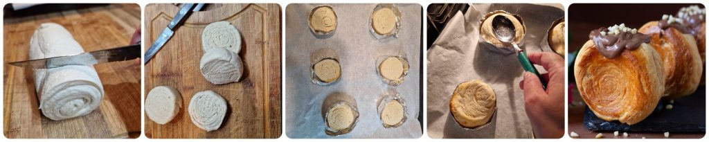 Maintenant, badigeonnez vos roulés avec le jaune d’œuf et enfournez pendant environ 15-20 minutes ou jusqu’à ce qu’ils soient dorés. ATTENTION : pendant la cuisson, les roulés vont tenter de gonfler, alors munissez-vous d’une cuillère à thé et appuyez dessus avec la partie concave vers l’intérieur pour les aplatir. Dès qu’ils sont prêts, laissez-les refroidir et préparez une poche à douille avec une douille en entonnoir et remplissez-la de crème de noisettes. Si la crème est trop épaisse, réchauffez-la au micro-ondes pendant quelques secondes. Ensuite, percez un trou sur le bord des roulés et farcissez-les de crème de noisettes en la laissant également sortir des côtés pour la décoration finale. Ensuite, décorez avec des éclats de noisettes et dégustez.