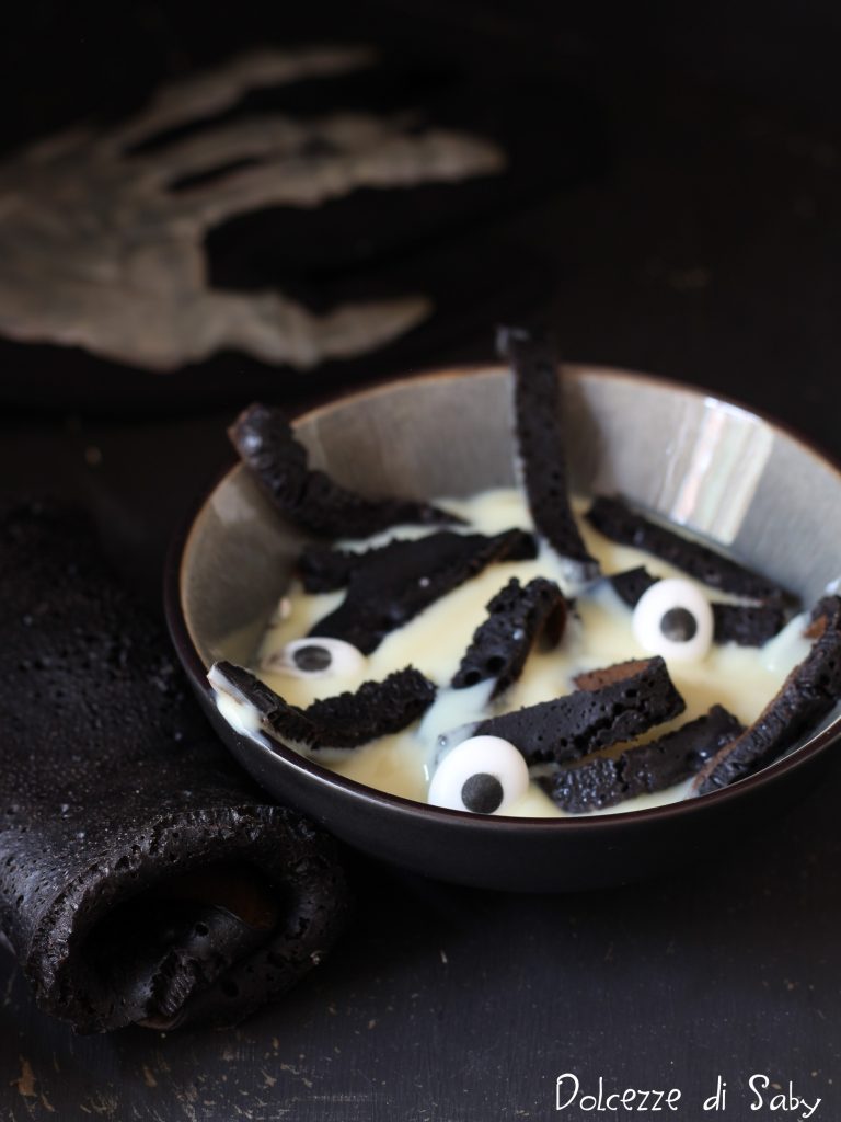 Chaque année, quand la période d’Halloween approche, j’essaie de préparer une recette à thème, qui soit à la fois gourmande et facile, tout en étant « drôlement effrayante » comme j’aime la définir. Cette année, après avoir préparé des pancakes noirs (recette que vous trouverez ci-dessous), l’idée de la soupe douce monstrueuse m’est venue immédiatement. Puis, j’avais aussi des petits yeux en sucre à la maison, donc parfait, tout est prêt, on commence la préparation de cette recette très très simple. Il s’agit d’une crème très rapide et de bandes de pancake noir qui simulent des vers… rien de plus !