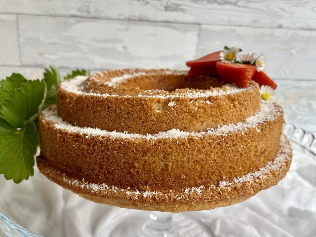 Gâteau à la noix de coco et aux fraises sans gluten, un dessert moelleux, humide et parfumé, parfait pour le petit déjeuner ou un délicieux goûter.