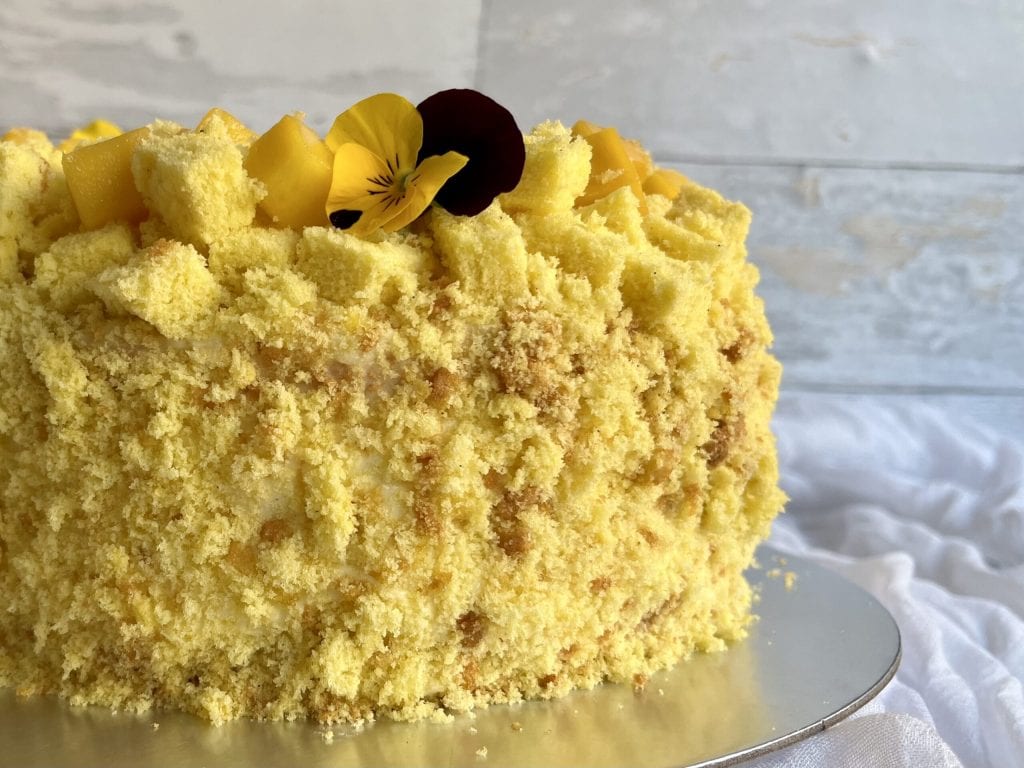 Le gâteau est recouvert de la même crème que la garniture, décoré avec de la génoise en cubes et émiettée, enfin des morceaux de mangue et des fleurs comestibles.