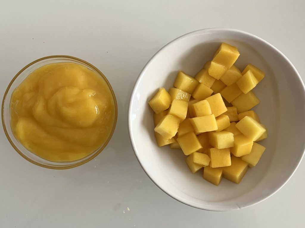 Place le premier disque, imbibe avec le sirop au limoncello, couvre d’une couche de crème (environ 1/3), étale quelques cuillères de purée et les morceaux de mangue.