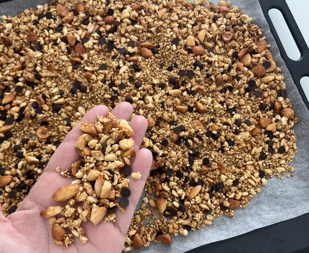 Une fois prête, sortez la granola du four et laissez-la refroidir complètement : en refroidissant, elle deviendra encore plus croquante.