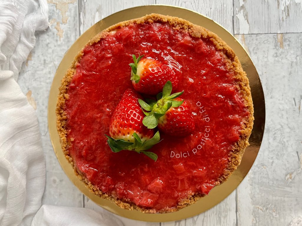 Après les 3 heures de repos de la cheesecake, recouvre avec la sauce aux fraises et mets au réfrigérateur pour au moins encore 3 heures.