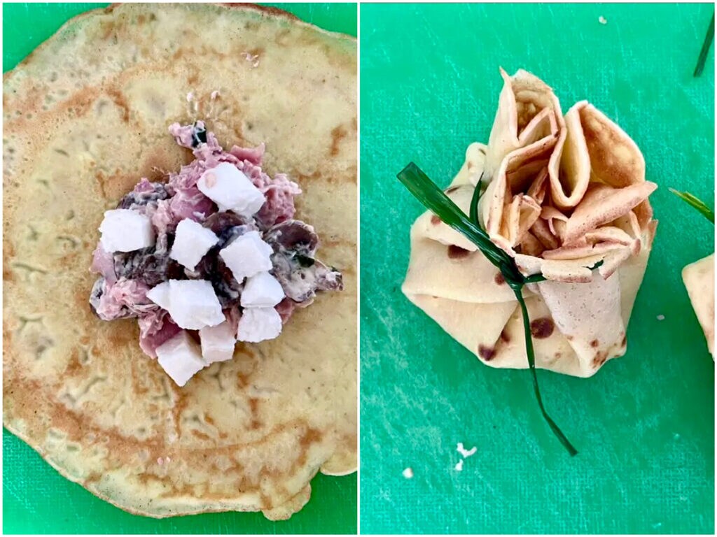 ** si vous ne voulez pas utiliser la ciboulette pour lier les pochettes, vous pouvez simplement replier les crêpes de manière à créer des « paquets ».
