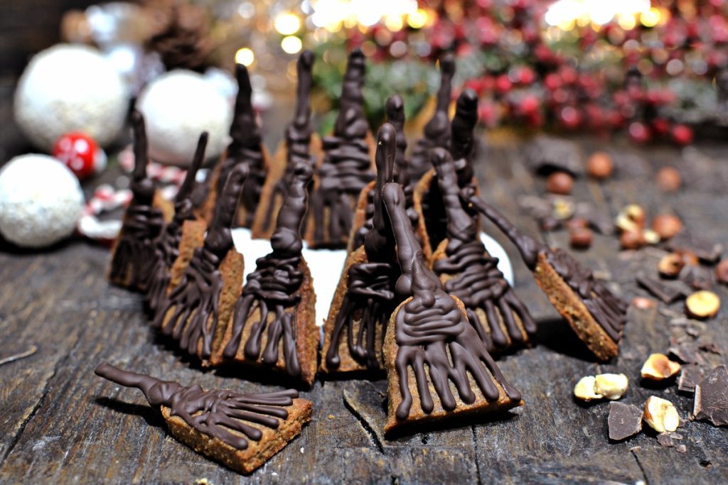 Les manches des balais biscuits sont réalisés en chocolat fondu pour éviter qu’ils ne se cassent : étant donné la petite taille des biscuits, un manche en pâte serait trop fin et fragile. Le chocolat, en revanche, assure une bonne tenue, il est plus résistant et apporte une touche gourmande qui plaît à tous.