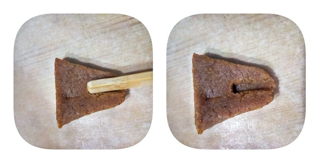 Étalez la pâte sur 4 cm d’épaisseur, sur un plan légèrement fariné (ou entre 2 feuilles de papier cuisson), découpez des formes de balai en utilisant un carton découpé comme guide, c’est simple, voici comment : tracez un balai sans manche (4 cm de hauteur / 4 cm de largeur en bas et 2 cm de largeur en haut). Puis découpez-le avec des ciseaux de cuisine