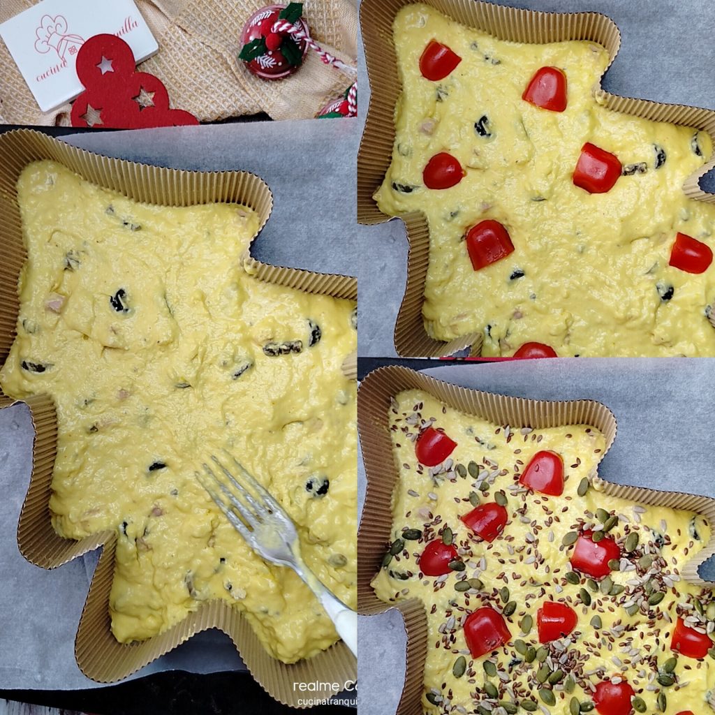 Arbre de Noël salé au safran avec olives et tomates cerises, une recette rustique particulière mais très simple à réaliser. On mélange avec une fourchette et tous les ingrédients s’ajoutent ensemble dans un grand bol. Pour le moule, j’ai utilisé les classiques en papier de 750 g que l’on trouve aussi au supermarché. Bien sûr, en alternative, vous pouvez utiliser des fouets électriques ou les moules que vous préférez, à condition que la capacité soit adaptée pour contenir toute la pâte. C’est une tarte salée très pratique à réaliser et, en fait, vous pouvez varier les ingrédients à votre guise, même la faire entièrement végétarienne. Ci-dessous, je vous laisse d’autres idées pour vous inspirer, tandis qu’à la fin de la recette, je réponds aux questions les plus courantes sur cette recette.