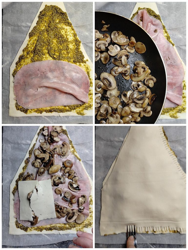 Arbre salé au pesto et jambon cuit, enrichi de nombreux champignons de Paris cuits à la poêle, une recette délicieuse de dernière minute, prête en quelques minutes et très jolie à présenter à table.