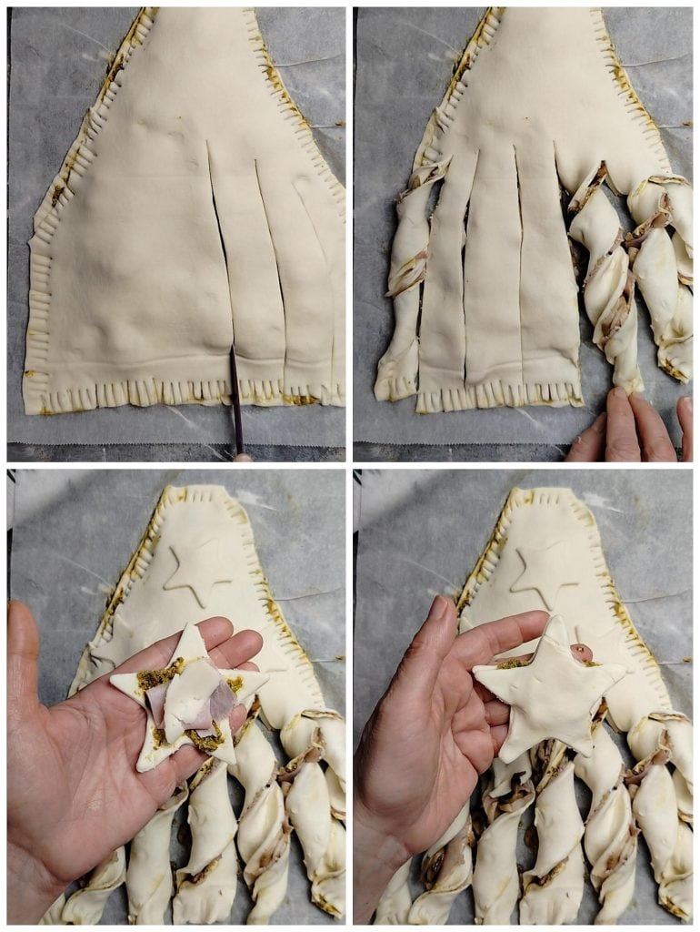 Pendant ce temps, découpez les deux arbres de Noël à partir des bases de pâte feuilletée, en procédant comme illustré sur la photo.