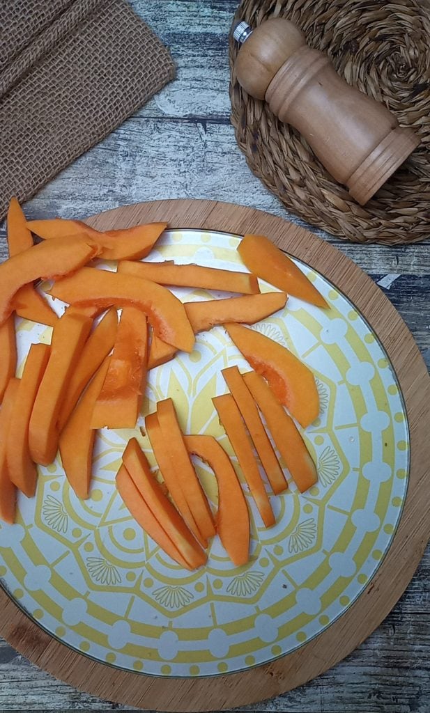 Bâtonnets de courge cuits au micro-ondes avec de la farine de maïs et du poivre, un accompagnement très facile et délicieux parfait pour de nombreuses occasions.