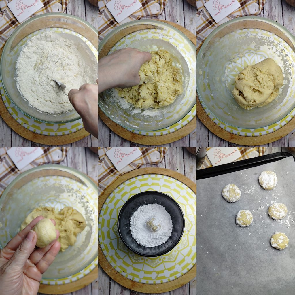 Mélangez avec une fourchette puis à la main jusqu’à obtenir une pâte lisse et homogène. Laissez reposer la pâte au réfrigérateur, recouverte dans le saladier, pendant environ 30 minutes. Passé ce temps, formez des boulettes de la taille d’une noix et roulez-les dans le sucre glace. Disposez-les, espacées, sur la plaque de cuisson recouverte de papier sulfurisé et aplatissez-les délicatement. Je vous conseille de procéder ainsi au fur et à mesure.