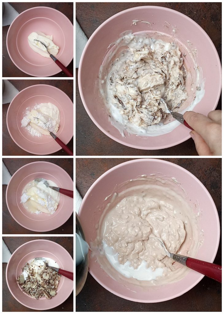 Maintenant, occupons-nous de la crème. Dans un bol, travaillez le fromage à tartiner avec le reste des gaufrettes grossièrement émiettées (réservez-en quelques-unes pour la décoration finale, si vous le souhaitez). Ajoutez le sucre glace, le lait avec la gélatine, le yaourt et le lait concentré.